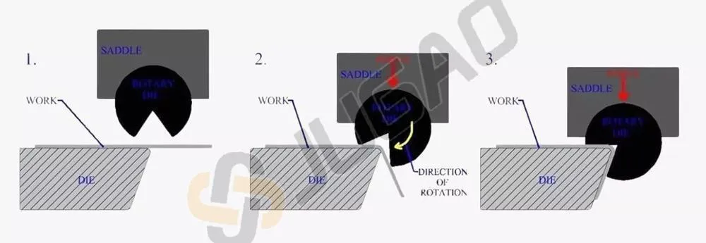 Le pliage rotatif est couramment utilisé pour le cintrage de tubes et de tuyaux avec des courbures allant de 1° à 180°, mais il est également applicable à la tôle. Le processus implique trois composants principaux : une matrice de pliage, une matrice de serrage et une matrice de pression. Les matrices de pliage et de serrage fixent la pièce, tandis que la matrice de pression applique une force tangentielle de l'extrémité libre vers le point de référence de pliage. Les matrices rotatives peuvent être ajustées pour un contrôle précis de l'angle et du rayon de pliage. Un mandrin est souvent inséré à l'intérieur des tubes pendant le cintrage pour éviter l'effondrement, mais il n'est pas nécessaire pour les pièces pleines en tôle.