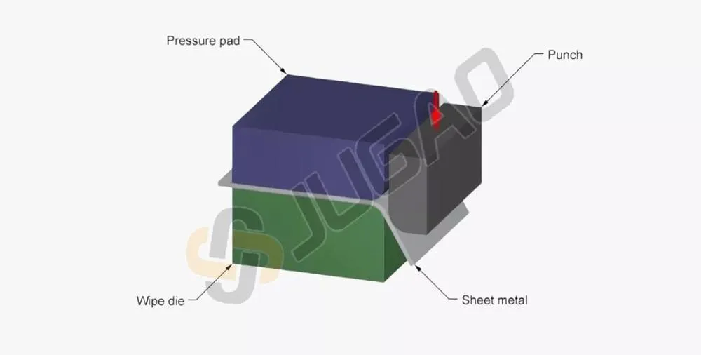 Le plissage par rabattement (ou pliage de bord) utilise une matrice de rabattement et un poinçon. La tôle est serrée entre la matrice et un patin de pression, exposant la section à plier. Le poinçon se déplace ensuite vers le bas, rabattant le matériau sur le bord de la matrice pour former l'angle souhaité. Cette méthode est une bonne alternative au pliage en presse pour les petites brides.