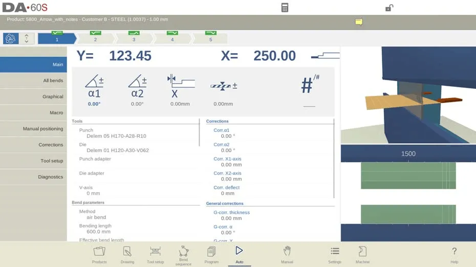 : Affiche à la fois les données numériques et les informations graphiques (si disponibles) pour le pliage. Il prend en charge la programmation directe des paramètres de correction et la commutation entre les vues graphiques/numériques. La position de pliage peut être vérifiée via les fonctions de zoom, de panoramique et de rotation. La vue outil se concentre automatiquement sur l'outil actuellement utilisé, indiquant la station d'outil correcte.