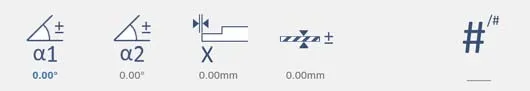 : Affiche les valeurs de correction pour toutes les étapes de pliage et prend en charge les ajustements si nécessaire. Lorsqu'une valeur de correction α1 est saisie, le système la copie automatiquement vers α2, maintient la différence entre les deux ou laisse α2 inchangé, selon le paramètre 'Programmation de correction d'angle'. La colonne 'Correction stockée' (affichée lorsque la base de données de correction d'angle est activée) indique la valeur de correction pour chaque pli ; une entrée vide signifie qu'il n'y a pas d'enregistrement dans la base de données, et un symbole '>' indique des valeurs de pliage identiques. Cliquer sur 'Tout à partir des stockées' synchronise toutes les valeurs de correction de pliage dans le programme avec celles de la base de données. De plus, il prend en charge l'ajout d'entrées dans le tableau des tolérances via 'Allongement de pliage' et le calcul des valeurs de correction à partir des angles mesurés (saisir un seul angle mesuré l'applique uniformément, tandis que saisir des valeurs gauche/droite/milieu permet une correction de bombage absolue). Un rapporteur optionnel peut saisir directement les valeurs mesurées, et les valeurs de correction sont mises à jour après un nouveau cycle de pliage.